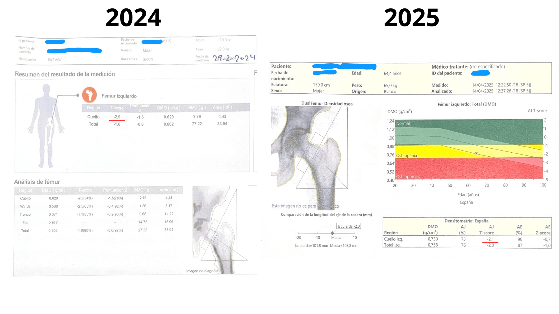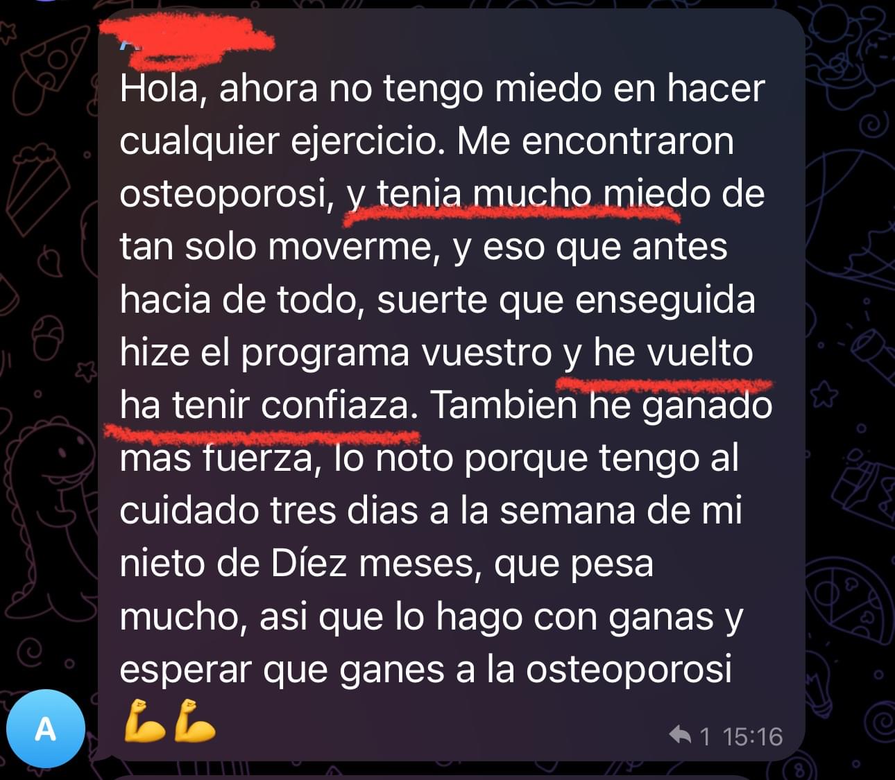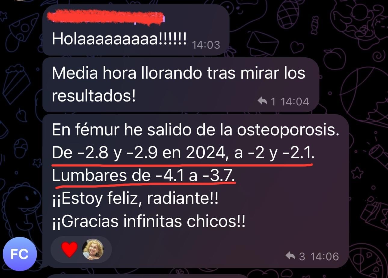 Con un plan de solo dos sesiones por semana, adaptado a su situación, pasamos de osteoporosis a osteopenia en un año. Y lo más importante: recuperó la confianza en su cuerpo.